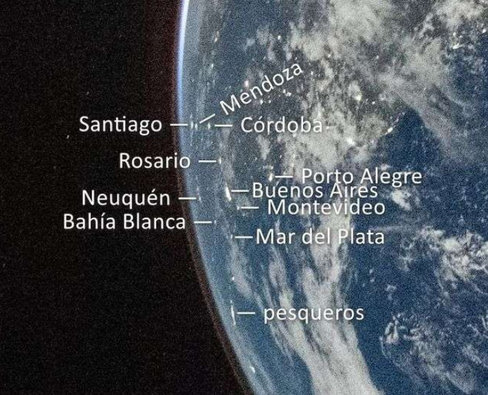 En otra de las imágenes difundidas también pueden identificarse luces de ciudades sudamericanas como Buenos Aires, Rosario, Neuquén, Bahía Blanca y Mar del Plata, además de puntos urbanos en Chile y Brasil, e incluso embarcaciones en el océano.