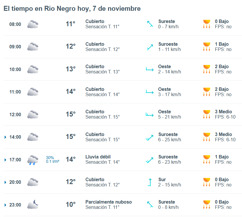 El pronóstico del tiempo para la ciudad de Río Negro, indica que hoy 7 de noviembre el cielo estará con lluvias aisladas por la mañana y la temperatura rondará entre 14 grados.