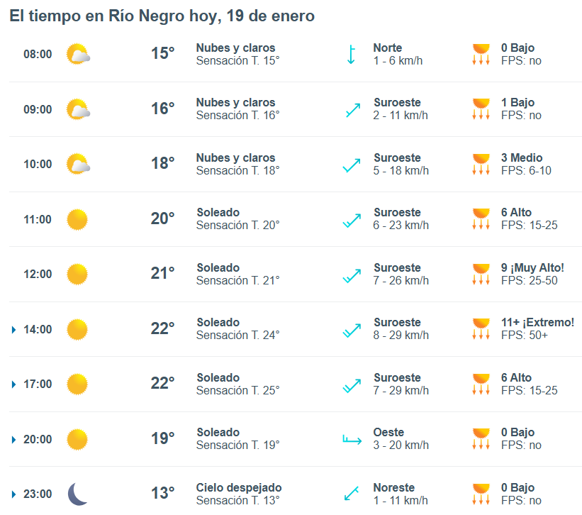 El pronóstico del tiempo para la ciudad de Río Negro, indica que hoy 19 de enero el cielo estará despejado por la mañana y la temperatura rondará entre 17 grados.