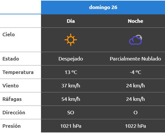 El parte del servicio meteorológico prevé que para después del mediodía el cielo estará parcialmente nublado y los vientos del sector sudoeste tendrán velocidades estimadas de entre 23 y 31 km/h. La temperatura pronosticada sería de 13 grados.