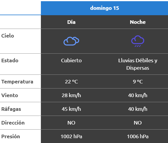 El parte del servicio meteorológico prevé que para después del mediodía el cielo estará con lluvias y los vientos del sector oeste tendrán velocidades estimadas de entre 42 y 50 km/h. La temperatura pronosticada sería de 19 grados.