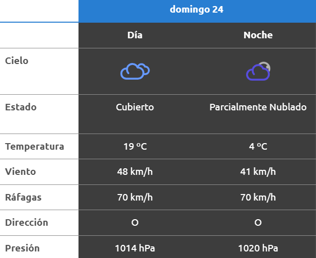 El parte del servicio meteorológico prevé que para después del mediodía el cielo estará mayormente nublado y los vientos del sector oeste tendrán velocidades estimadas entre 42 y 50 km/h. La temperatura pronosticada sería de 20 grados.