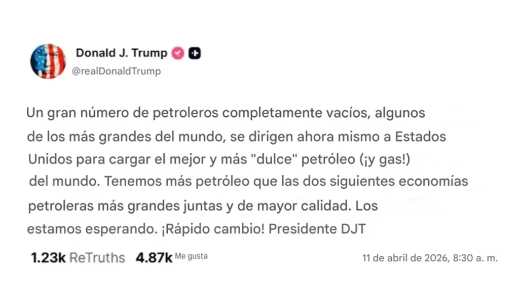 En el mismo posteo, Trump destacó el potencial energético de su país y señaló que numerosos petroleros vacíos se dirigen hacia Estados Unidos para cargar “el mejor petróleo y gas del mundo”, al tiempo que aseguró que su nación cuenta con mayores reservas que otras potencias del sector.
