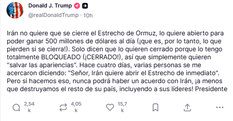 En un mensaje publicado en la red social Truth Social, el mandatario sostuvo que cualquier intento por reabrir el estrecho de Ormuz complicaría las negociaciones y lanzó una fuerte amenaza: aseguró que no habría acuerdo “a menos que destruyéramos el resto del país”.
