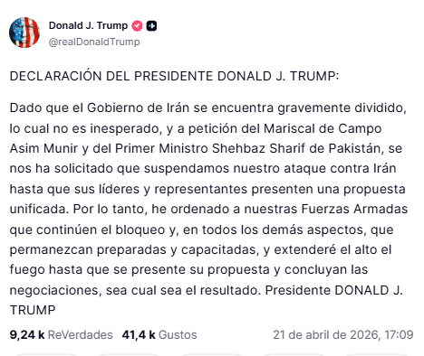 Horas antes, el propio Trump había señalado que evaluaba extender el alto el fuego vigente con Irán, cuya duración inicial de dos semanas estaba prevista para finalizar este miércoles por la noche. Sin embargo, sus recientes dichos vuelven a poner en duda la continuidad de esa tregua.