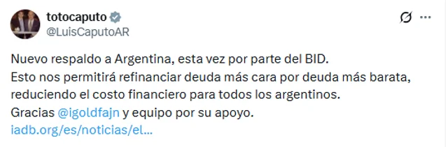 El ministro de Economía, Luis Caputo, afirmó que el esquema permitirá “refinanciar deuda más cara por deuda más barata”, con impacto en la reducción del costo financiero. En esa línea, el presidente del Grupo BID, Ilan Goldfajn, sostuvo que el organismo acompaña el proceso de reformas con mayor escala de inversión y apoyo a la movilización de capital privado.