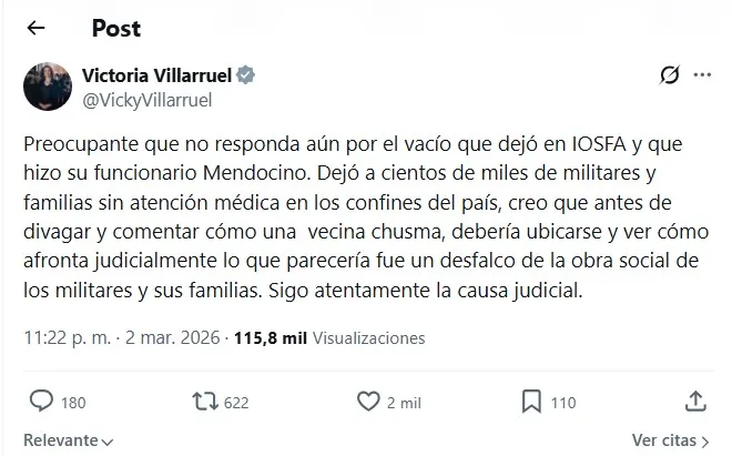 En otro mensaje, Villarruel señaló que antes de “divagar y comentar como una vecina chusma”, el diputado debería explicar lo que consideró un presunto desmanejo en la obra social de militares y sus familias, y afirmó que sigue “atentamente la causa judicial”.