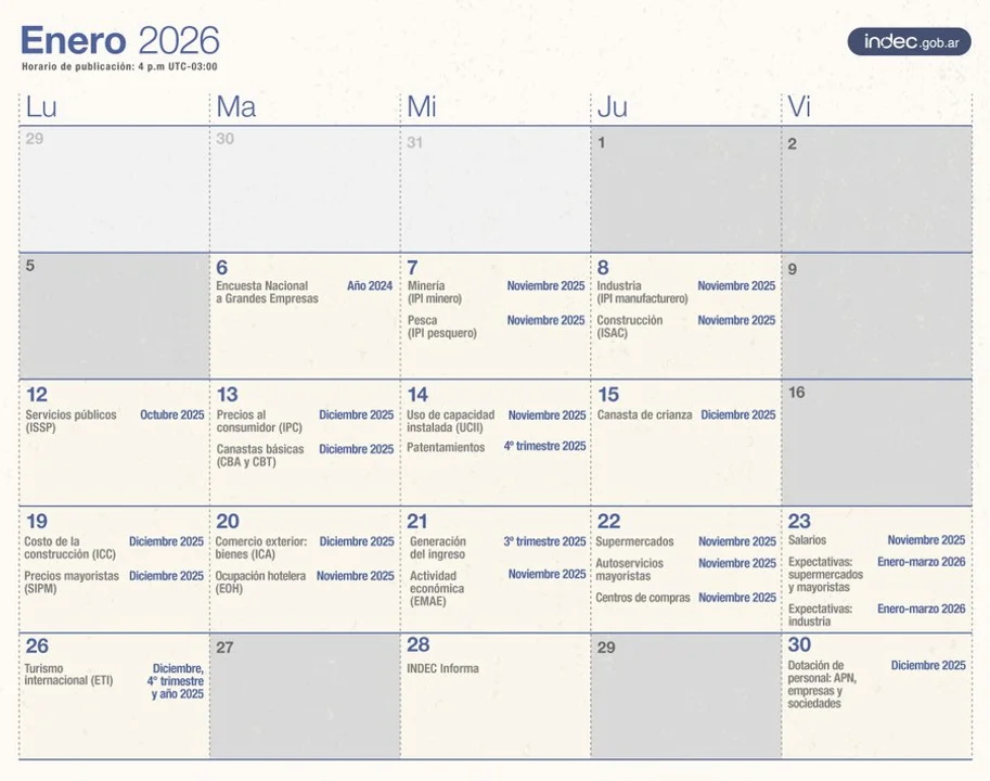 En paralelo, el Instituto Nacional de Estadísticas y Censos (INDEC) difundirá esta semana los primeros indicadores económicos de 2026. La industria continúa en retroceso, con una caída del 2,9% en octubre y cuatro meses consecutivos en baja. La construcción, en cambio, muestra un desempeño más favorable: creció 8% interanual en noviembre y acumula un alza de 7,9% en los primeros diez meses de 2025, aunque registró una leve contracción mensual del 0,5%.