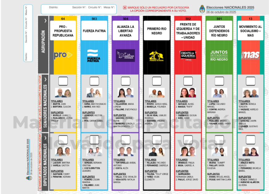 Por segunda vez, Río Negro utilizará la Boleta Única de Papel (BUP), en la que cada fuerza aparece en un casillero con símbolos y colores distintivos. En esta elección participan siete agrupaciones, por lo que cada una tendrá más espacio que el mínimo estipulado.