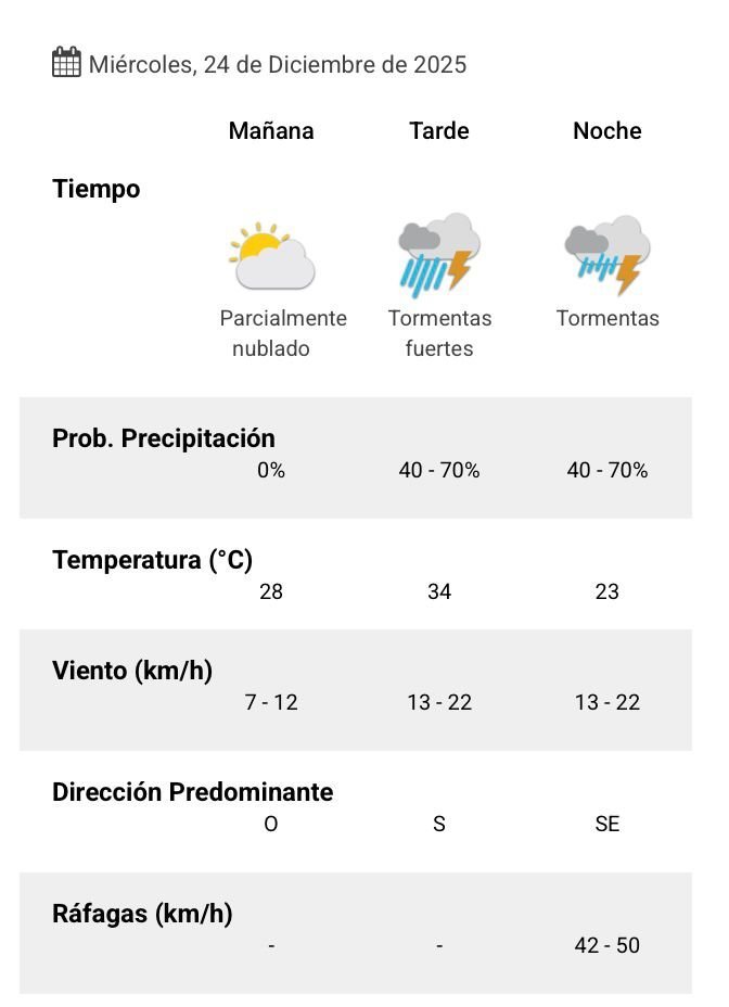 A la noche, el clima rondará los 23 grados, mientras que el pronóstico indica tormentas con una probabilidad de precipitación del 70 por ciento.