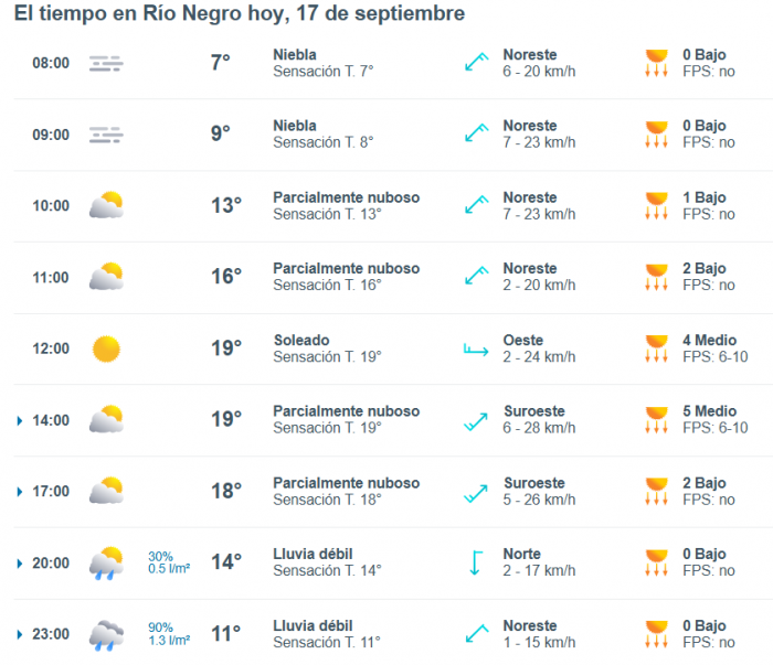 De acuerdo al parte del Servicio Meteorológico Nacional, el clima en esta ciudad de Río Negro se presentaría sin lluvias, y los vientos del este correrán a una velocidad de entre 13 y 22 kilómetros por hora. La humedad sería del 93 por ciento, y la visibilidad sería buena.