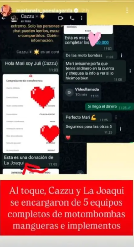 Por su parte, Emilia Mernes también se sumó con una donación significativa y utilizó su amplia llegada en redes sociales para amplificar el mensaje y visibilizar la gravedad de la situación ambiental que atraviesa la región.