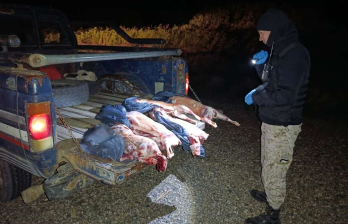 El primer procedimiento ocurrió pasada la medianoche, a las 00:15, cuando los efectivos detuvieron una camioneta Chevrolet azul con franjas blancas y rojas en la zona de “La Fragua”. Al volante se encontraba un hombre de 54 años, vecino de Bariloche, quien reconoció que transportaba carne faenada.