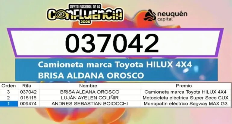 En primera instancia se sorteó un monopatín eléctrico. Con el número 009474, el ganador fue Andrés Sebastián Boiocchi. Posteriormente, con el 015115, Luján Ayelén Coliñir, se adjudicó la moto eléctrica.