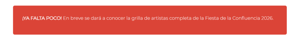 En la web oficial de la fiesta (www.fiestaconfluencia.com.ar) se informa que “ya falta poco” para revelar la lista completa de artistas y que próximamente también se habilitará la venta de entradas preferenciales, mientras que el ingreso general seguirá siendo libre y gratuito.