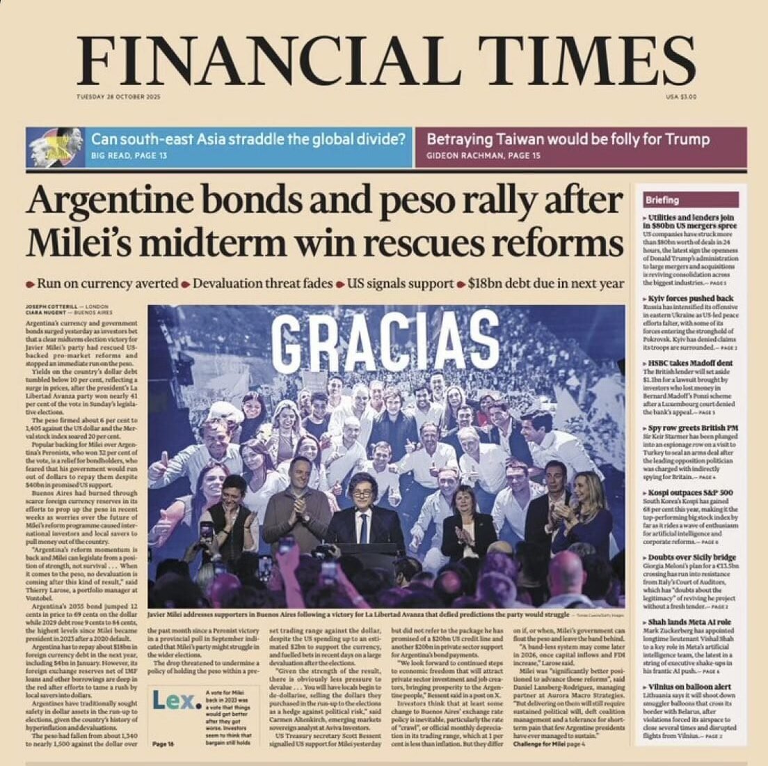 En su análisis, el medio británico especializado en finanzas subrayó que los bonos soberanos y el peso argentino se fortalecieron con fuerza luego del triunfo de La Libertad Avanza (LLA) en las elecciones de medio término. Según el artículo, el desenlace electoral favorable al oficialismo “evitó una corrida cambiaria” y permitió que “la amenaza de devaluación se desvanezca”.