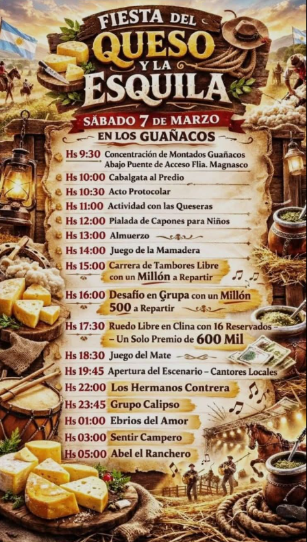 El programa incluye un homenaje especial a las queseras y esquiladores locales, además de actividades vinculadas a la elaboración de queso, una cabalgata hacia el predio y exhibiciones de esquila. También habrá destrezas criollas como pialada de capones, boleada del choique y carrera de tambores libre.