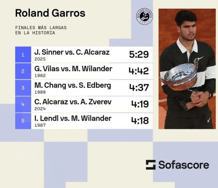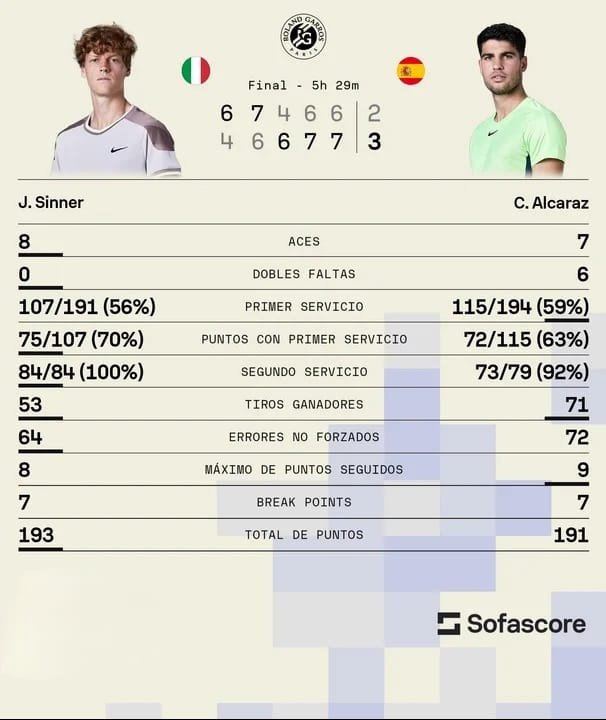 En una final que quedará en la historia grande del tenis, Carlos Alcaraz venció a Jannik Sinner por 4-6, 6(5)-7, 6-4, 7-6(3) y 7-6(2) en 5 horas y 29 minutos, el partido más largo jamás jugado en Roland Garros. El español se consagró campeón en París por segunda vez y sumó su quinto título de Grand Slam.