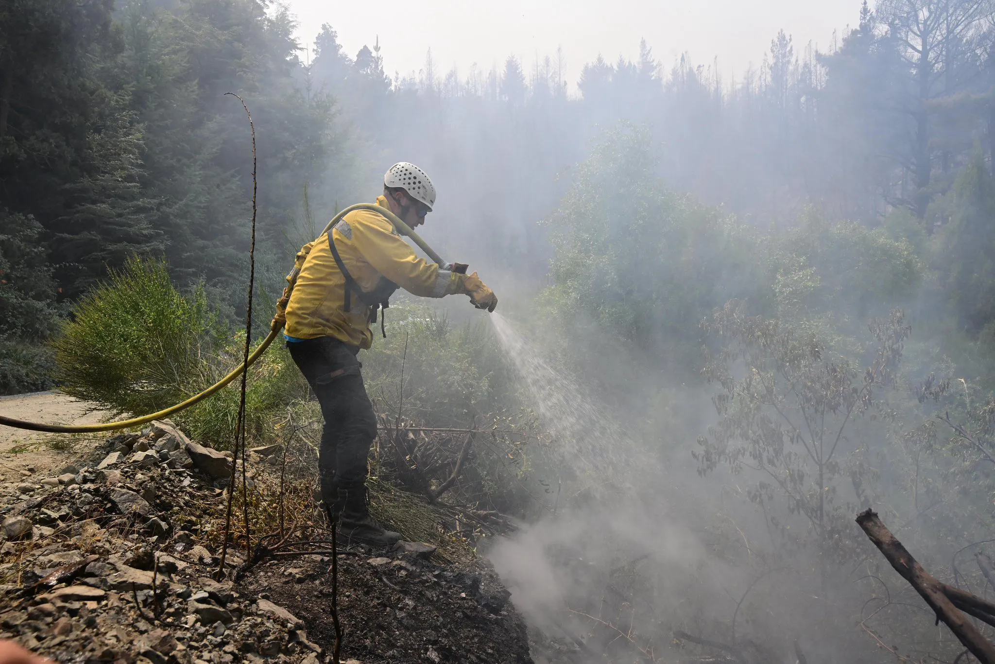 En el Parque Nacional Los Alerces, persisten focos de “comportamiento extremo” en el Arroyo Braese, aunque las lluvias ayudaron a controlar el fuego en la zona, mientras en Epuyén el Estado de Catástrofe continúa vigente tras haber sido devastada más de la mitad del ejido municipal.
