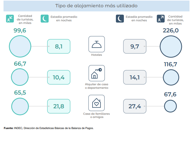 Respecto al alojamiento, el 38,8% eligió hoteles de 4 y 5 estrellas, seguido por estadías en casas de familiares o amigos (25,9%). La estadía promedio fue de 6,1 noches, mientras que el gasto total de los turistas no residentes alcanzó los 30,5 millones de dólares.