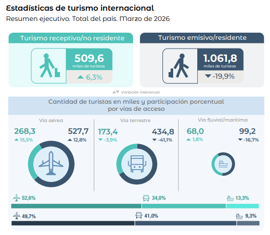 El Instituto Nacional de Estadística y Censos (INDEC) informó que el turismo internacional en Argentina registró en marzo de 2026 un crecimiento interanual del 6,3% en el ingreso de visitantes no residentes, según la Encuesta de Turismo Internacional (ETI).