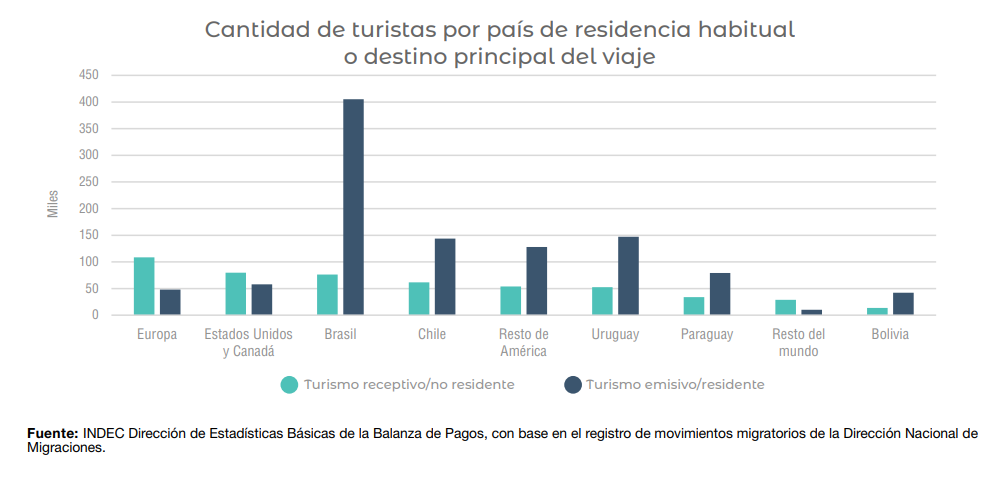 De acuerdo con el informe oficial, ingresaron al país 824,3 mil visitantes extranjeros, de los cuales 509,6 mil fueron turistas y 314,7 mil excursionistas. El turismo receptivo se concentró principalmente en viajeros provenientes de Europa (21,3%), Estados Unidos y Canadá (15,6%) y Brasil (15%).