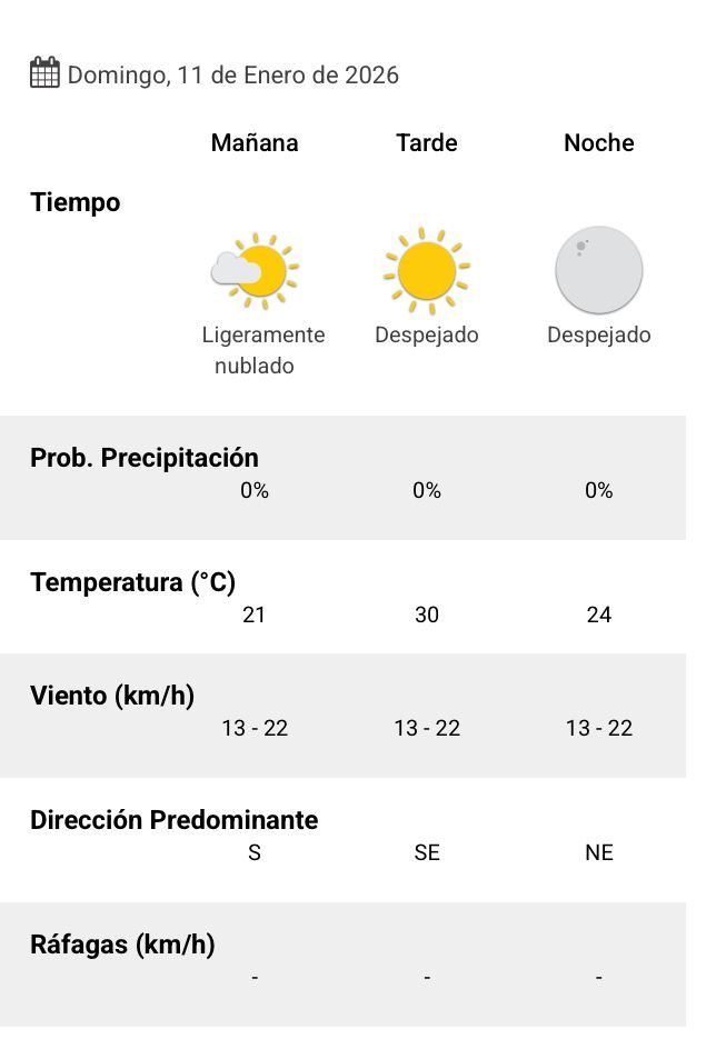 De acuerdo al parte del Servicio Meteorológico Nacional, el clima se presentaría sin lluvias, y los vientos del sur correrán a una velocidad de entre 13 y 22 kilómetros por hora. La humedad sería del 82 por ciento, y la visibilidad sería buena.