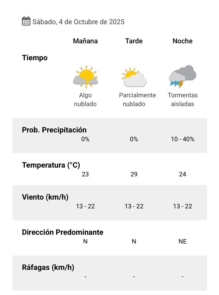 De acuerdo al parte del Servicio Meteorológico Nacional, el clima se presentaría sin lluvias, y los vientos del norte correrán a una velocidad de entre 13 y 22 kilómetros por hora. La humedad sería del 88 por ciento, y la visibilidad sería buena.