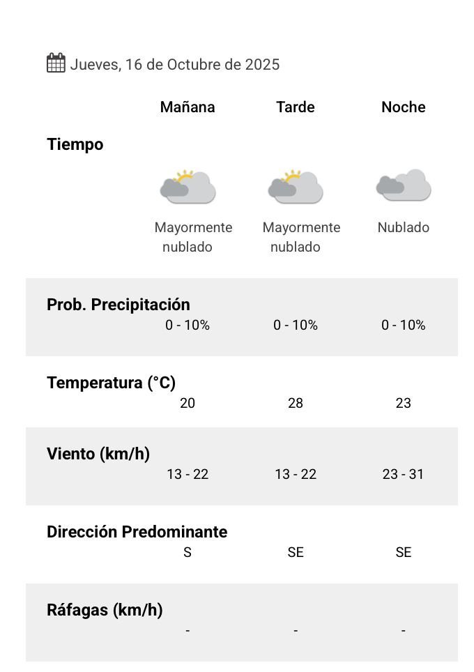 El parte del servicio meteorológico prevé que para después del mediodía el cielo estará parcialmente nublado y los vientos del sector este tendrán velocidades estimadas entre 23 y 31 km/h. La temperatura pronosticada sería de 26 grados.