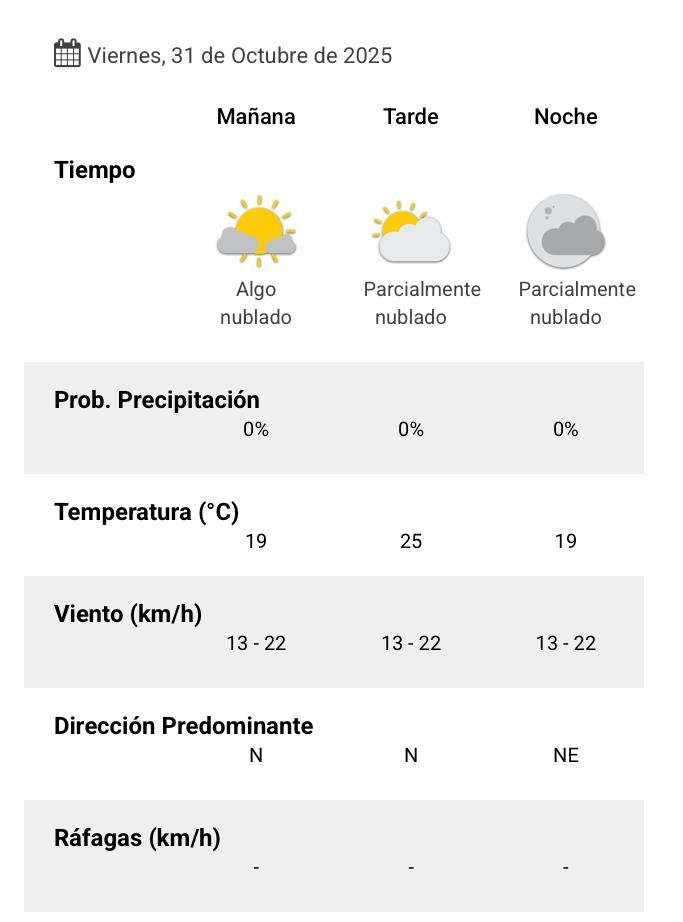 De acuerdo al parte del Servicio Meteorológico Nacional, el clima se presentaría sin lluvias, y los vientos del norte correrán a una velocidad de entre 13 y 22 kilómetros por hora. La humedad sería del 68 por ciento, y la visibilidad sería buena.