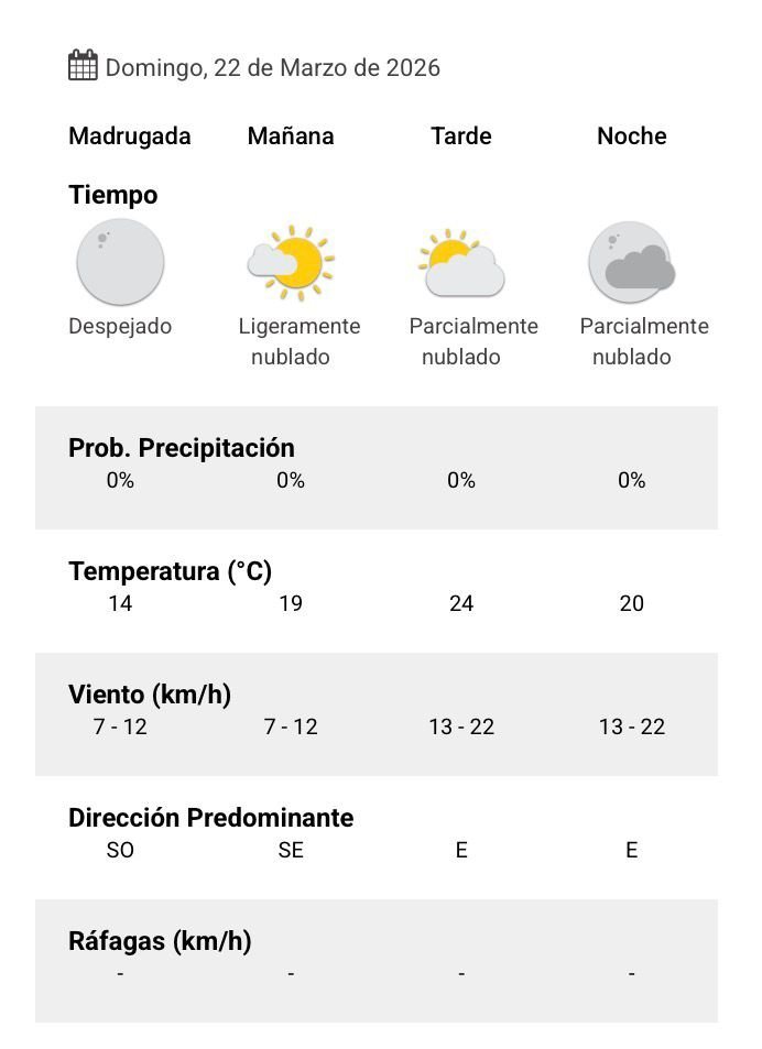 El parte del servicio meteorológico prevé que para después del mediodía el cielo estará parcialmente nublado y los vientos del sector este tendrán velocidades estimadas de entre 13 y 22 km/h. La temperatura pronosticada sería de 24 grados.