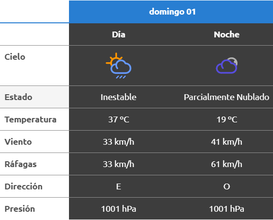 El parte del servicio meteorológico prevé que para después del mediodía el cielo estará parcialmente nublado y los vientos del sector norte tendrán velocidades estimadas de entre 23 y 31 km/h. La temperatura pronosticada sería de 32 grados.