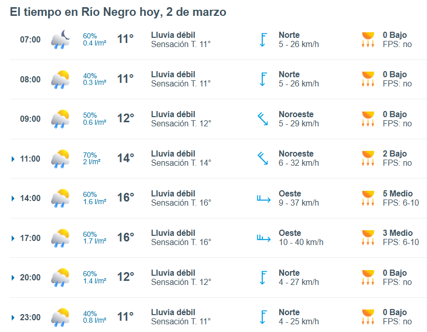 El pronóstico del tiempo para la ciudad de Río Negro, indica que hoy 2 de marzo el cielo estará con lluvias por la mañana y la temperatura rondará entre 6 grados.