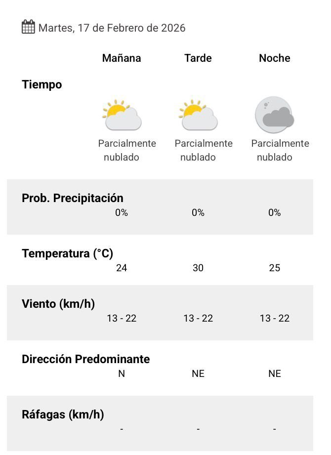 El parte del servicio meteorológico prevé que para después del mediodía el cielo estará nublado y los vientos del sector noreste tendrán velocidades estimadas entre 13 y 22 km/h. La temperatura pronosticada sería de 30 grados.