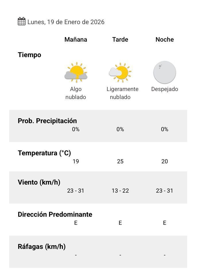 El parte del servicio meteorológico prevé que para después del mediodía el cielo estará ligeramente nublado y los vientos del sector este tendrán velocidades estimadas de entre 13 y 22 km/h. La temperatura pronosticada sería de 25 grados.
