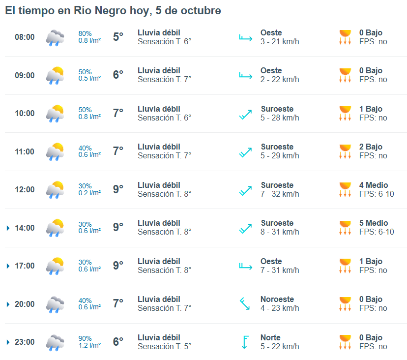 El pronóstico del tiempo para la ciudad de Viedma, indica que hoy 5 de octubre el cielo estará con chaparrones por la mañana y la temperatura rondará entre 10 grados.