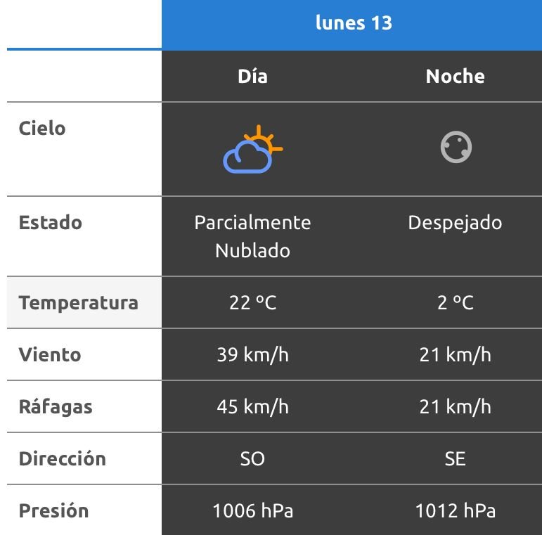 El parte del servicio meteorológico prevé que para después del mediodía el cielo estará algo nublado y los vientos del sector sudoeste tendrán velocidades estimadas entre 23 y 31 km/h. La temperatura pronosticada sería de 20 grados.