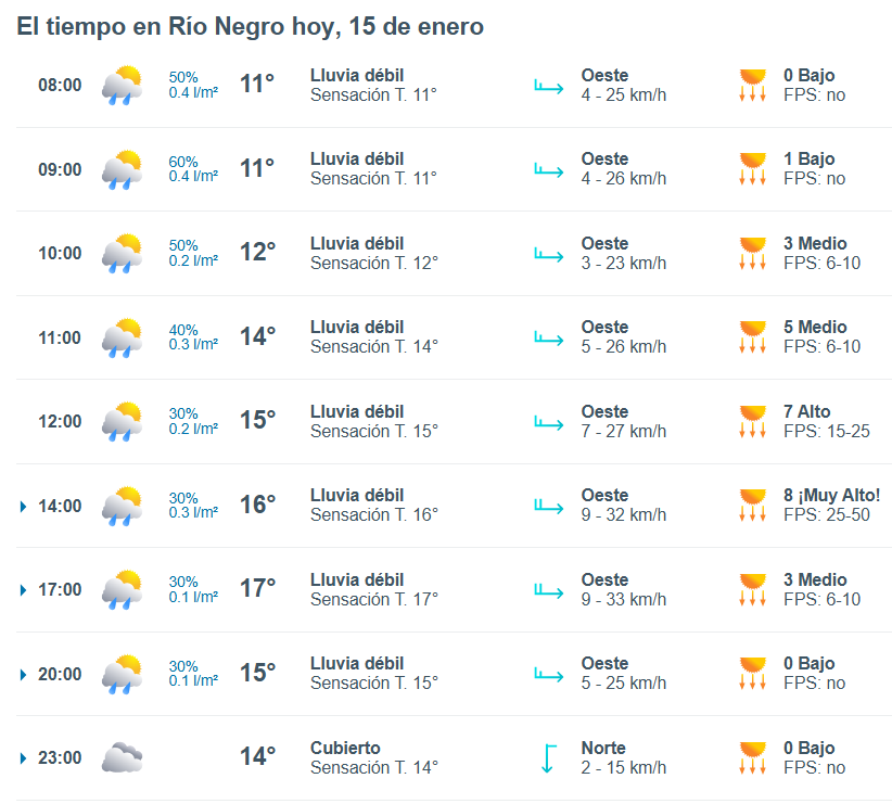 El pronóstico del tiempo para la ciudad de Río Negro, indica que hoy 15 de enero el cielo estará con lluvias aisladas por la mañana y la temperatura rondará entre 4 grados.