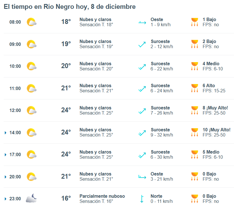 El pronóstico del tiempo para la ciudad de Río Negro, indica que hoy 8 de diciembre el cielo estará mayormente nublado por la mañana y la temperatura rondará entre 21 grados.