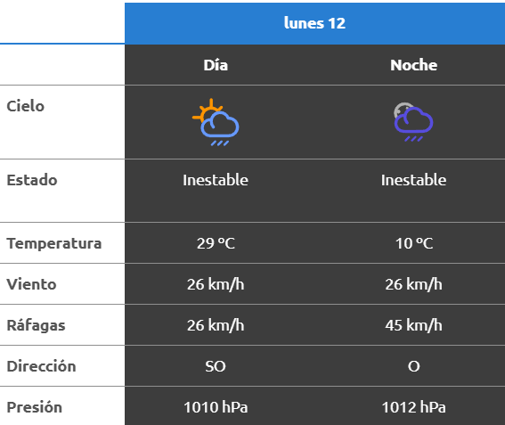 A la noche, el clima rondará los 25 grados, mientras que los vientos serán del sudoeste a una velocidad de 32 y 41 kilómetros por hora. La probabilidad de lluvia estaría en el orden del entre 10 y 40 por ciento para esta franja del día.