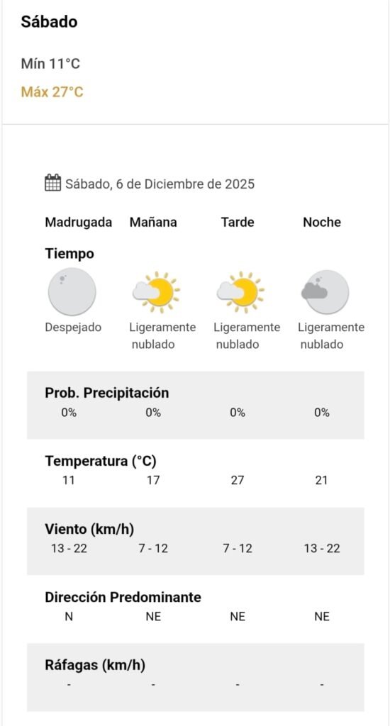De acuerdo al parte del Servicio Meteorológico Nacional, el clima se presentaría sin lluvias, y los vientos del noreste correrán a una velocidad de entre 7 y 12 kilómetros por hora. La humedad sería del 78 por ciento, y la visibilidad sería buena.