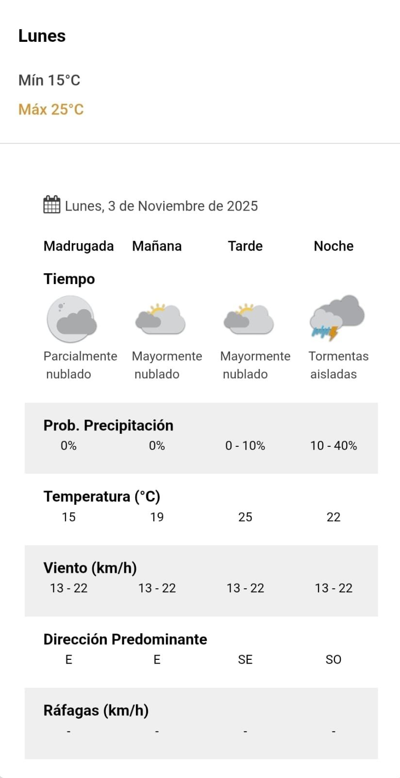 El parte del servicio meteorológico prevé que para después del mediodía el cielo estará mayormente nublado y los vientos del sector sudeste tendrán velocidades estimadas de entre 13 y 22 km/h. La temperatura pronosticada sería de 25 grados.