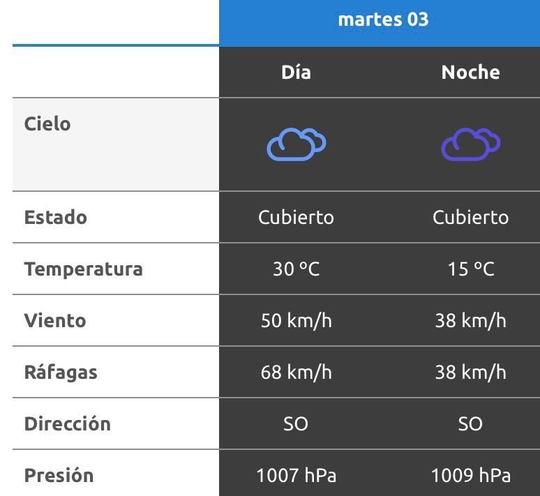 El parte del servicio meteorológico prevé que para después del mediodía el cielo estará mayormente nublado y los vientos del sector sudoeste tendrán velocidades estimadas de entre 23 y 31 km/h. La temperatura pronosticada sería de 29 grados.
