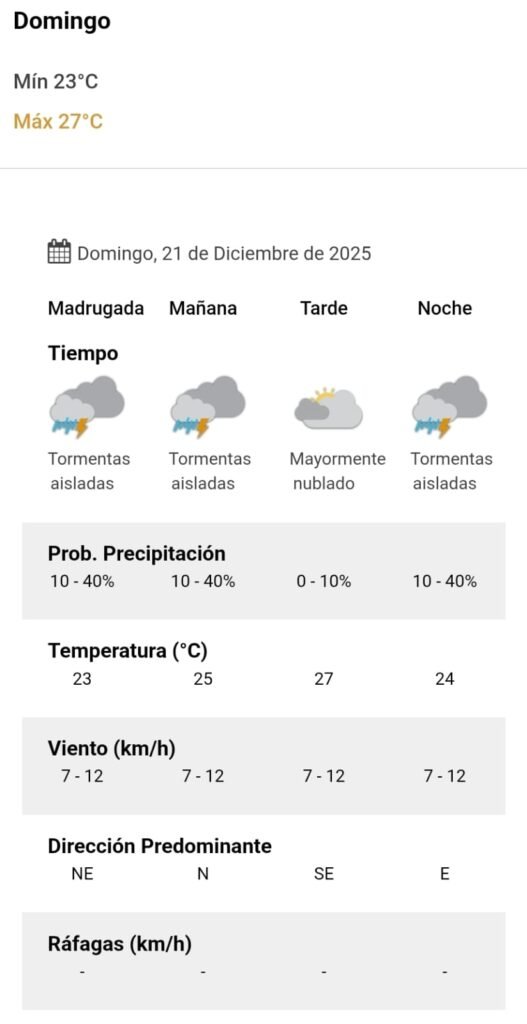 El parte del servicio meteorológico prevé que para después del mediodía el cielo estará mayormente nublado y los vientos del sector sudeste tendrán velocidades estimadas de entre 7 y 12 km/h. La temperatura pronosticada sería de 27 grados.