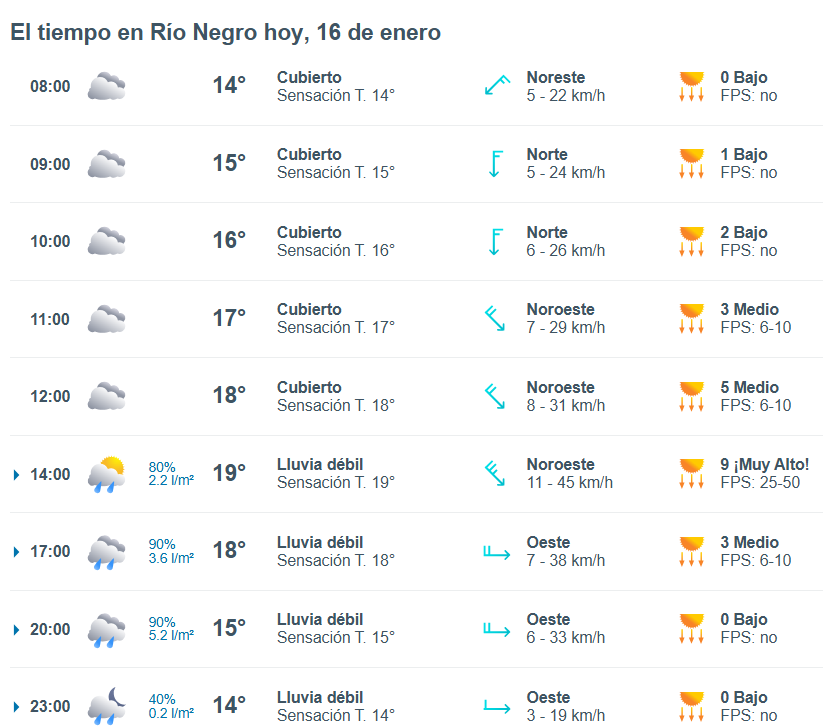 El pronóstico del tiempo para la ciudad de Río Negro, indica que hoy 16 de enero el cielo estará mayormente nublado por la mañana y la temperatura rondará entre 12 grados.