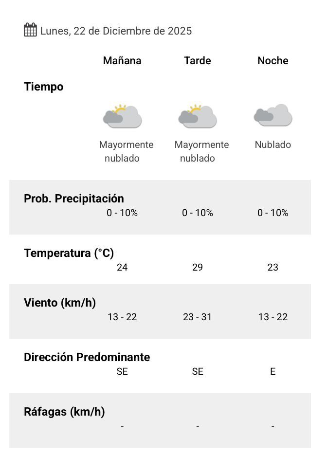 El parte del servicio meteorológico prevé que para después del mediodía el cielo estará mayormente nublado y los vientos del sector sudeste tendrán velocidades estimadas de entre 23 y 31 km/h. La temperatura pronosticada sería de 29 grados.