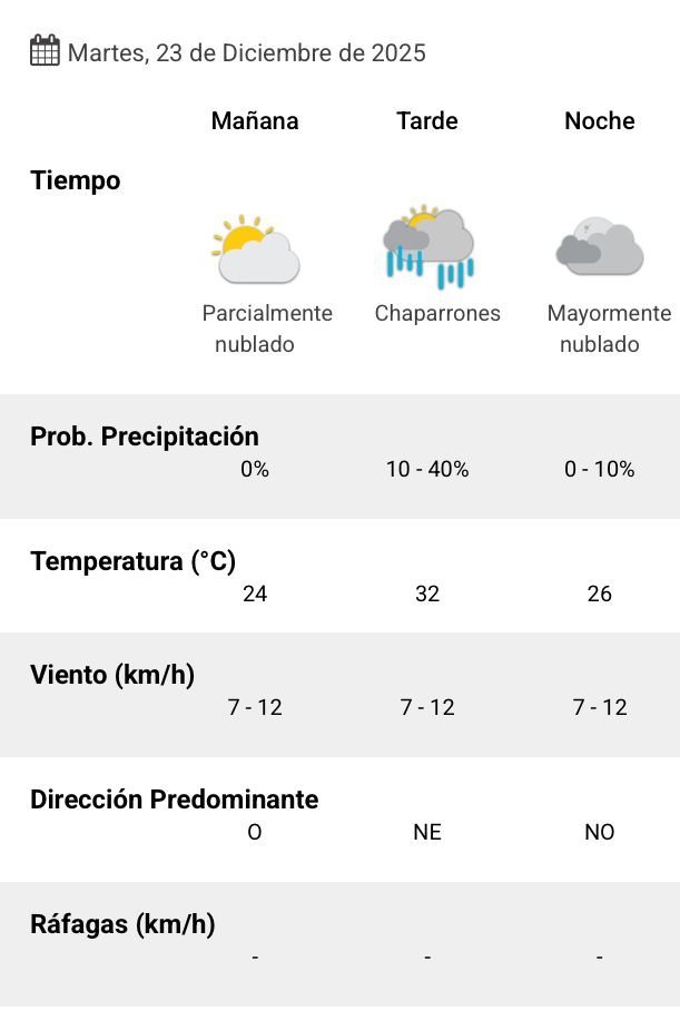El parte del servicio meteorológico prevé que para después del mediodía el cielo estará mayormente nublado y los vientos del sector noreste tendrán velocidades estimadas de entre 7 y 12 km/h. La temperatura pronosticada sería de 32 grados.