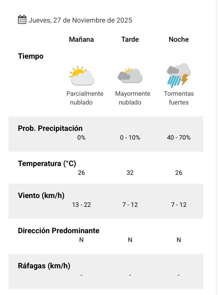 A la noche, el clima rondará los 26 grados, mientras que los vientos serán del norte y soplarán  a una velocidad de entre 23 y 31 kilómetros por hora. La probabilidad de lluvia estaría en el orden del entre 40 y 70 por ciento para esta franja del día.