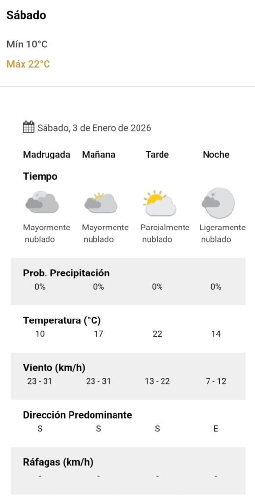 De acuerdo al parte del Servicio Meteorológico Nacional, el clima se presentaría sin lluvias, y los vientos del sur correrán a una velocidad de entre 23 y 31 kilómetros por hora. La humedad sería del 57 por ciento, y la visibilidad sería buena.