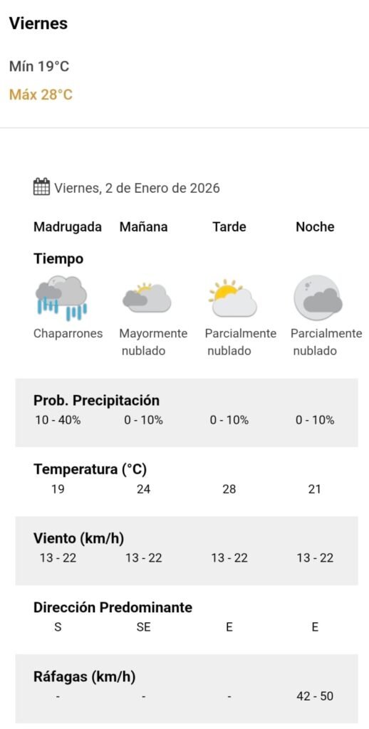 El parte del servicio meteorológico prevé que para después del mediodía el cielo estará parcialmente nublado y los vientos del sector este tendrán velocidades estimadas de entre 13 y 22 km/h. La temperatura pronosticada sería de 28 grados.
